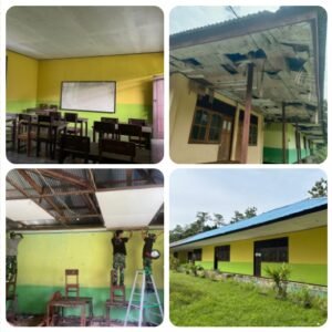KEEROM, PAPUA | – Personil Satgas Pos Wembi pimpinan Dankipur D Kapten Inf Dwi Ari Wibowo, S. T. Han. Merehab SD YPPK Wembi sebagai bentuk kepedulian terhadap dunia pendidikan, Kampung Wembi, Distrik Mannem, Kab. Keerom, Prov. Papua. (30/1/).